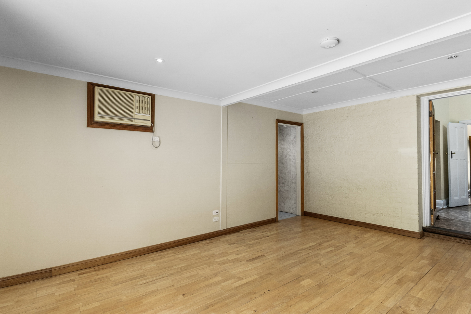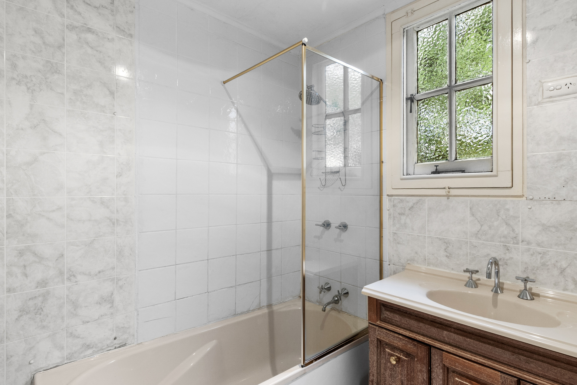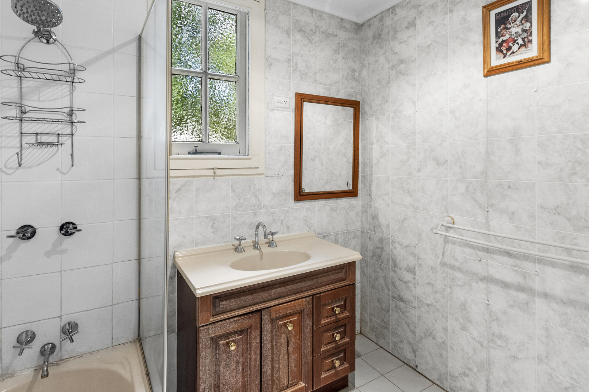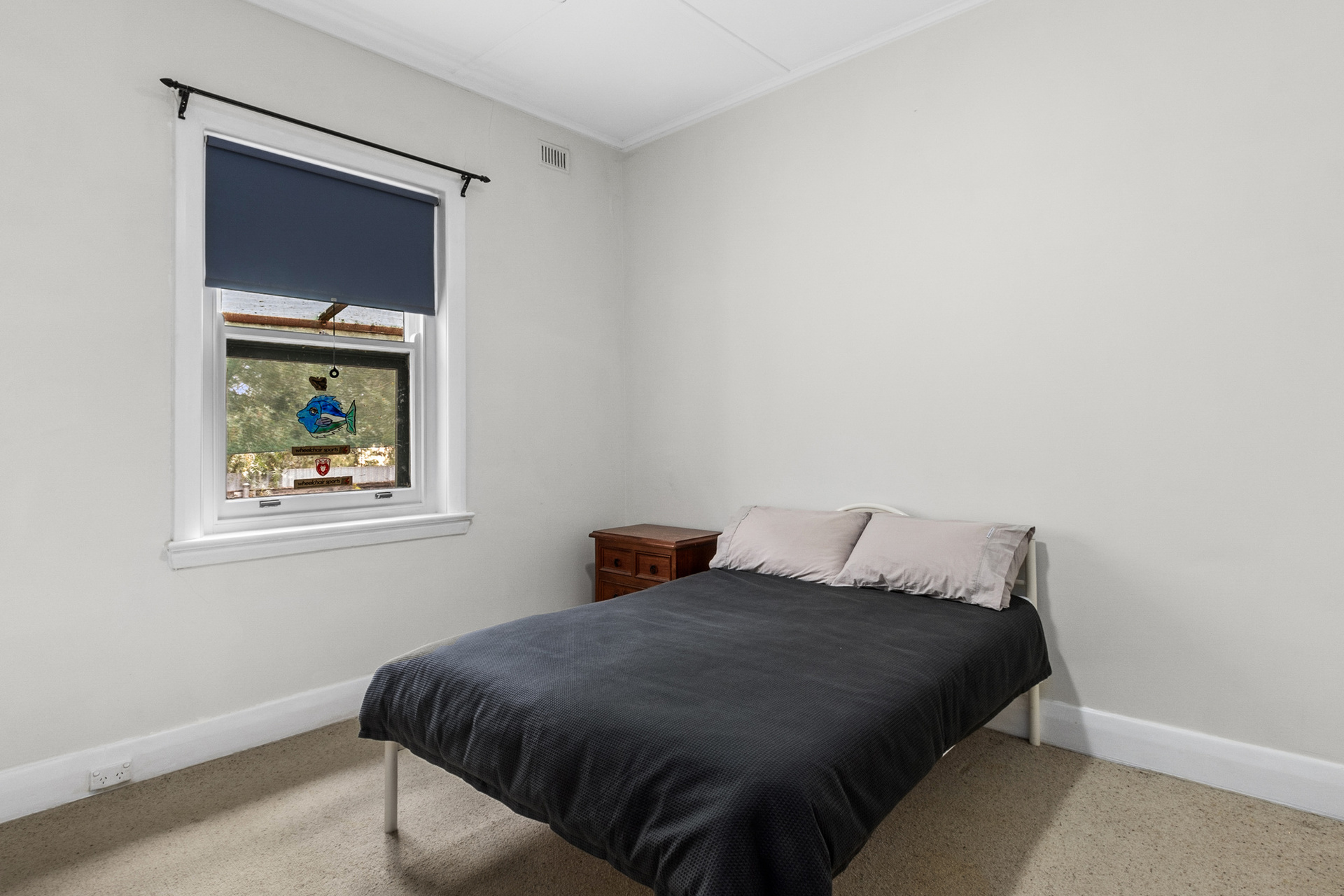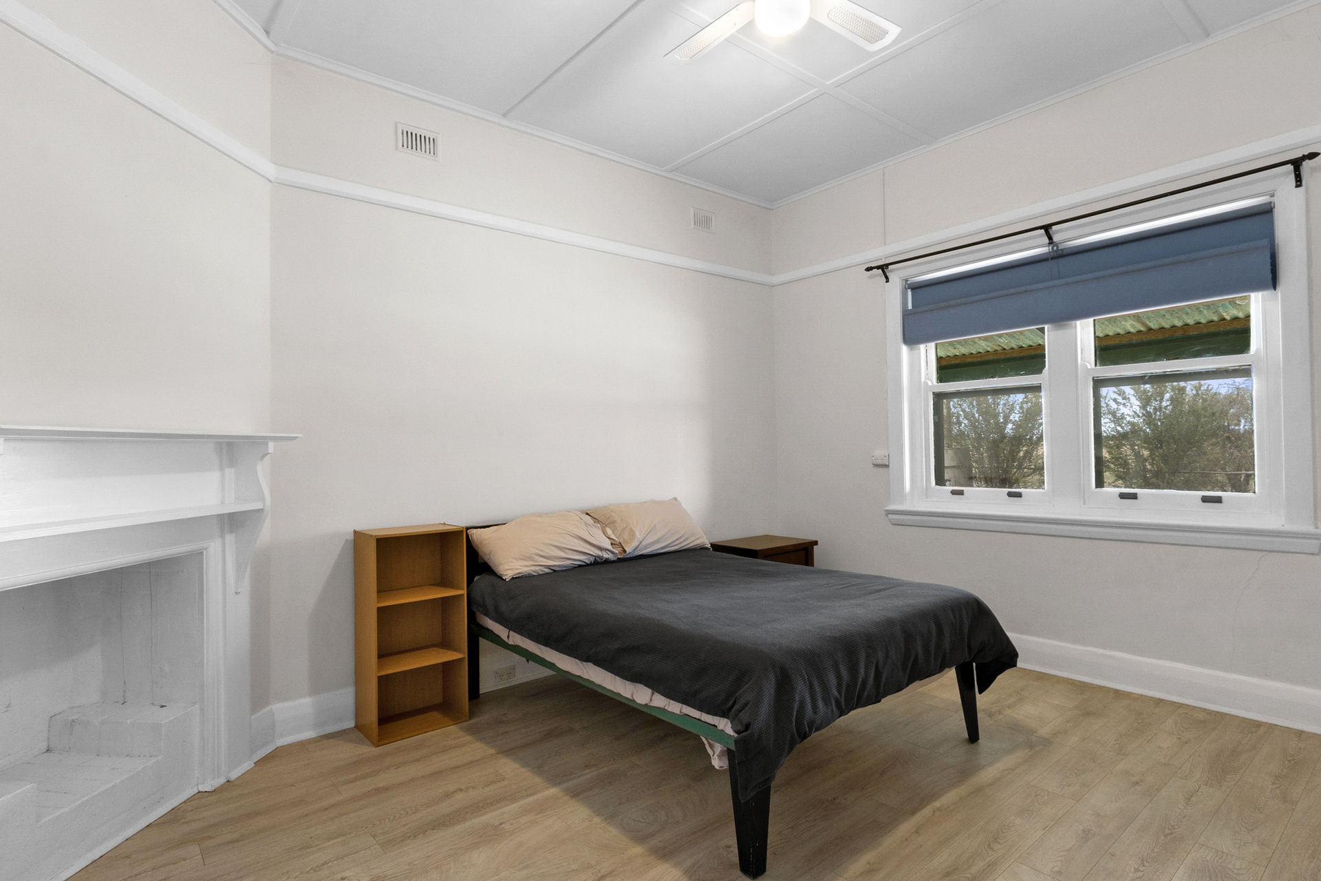 Enter the spacious central hallway with three good size bedrooms on either side, one with a feature fireplace, one with a split system ac and two with ceiling fans. All rooms are light and bright with high ceilings and two have floating floors.